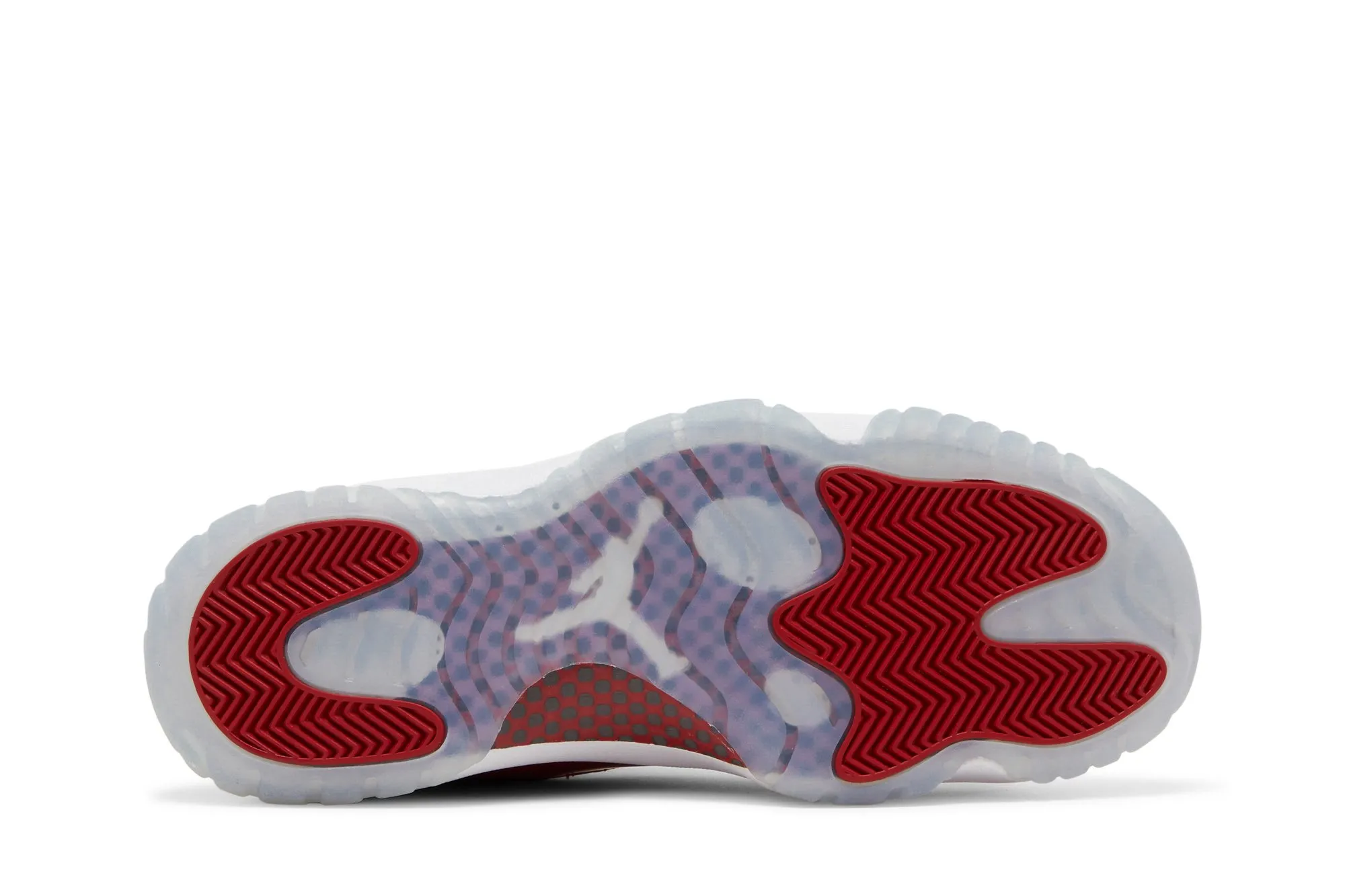 The Air Jordan 11 Retro Cherry showcases familiar two-tone color blocking that recalls the low-top AJ11 Varsity Red from 2001. The upper is crafted from white ballistic mesh with tonal webbing eyelets and a shiny patent leather mudguard in a bold scarlet hue. Matching red accents land on the interior collar and an embroidered Jumpman on the white leather heel overlay. Lightweight cushioning arrives via a plush Phylon midsole, supported underfoot by a carbon fiber spring plate and a translucent rubber outsole.