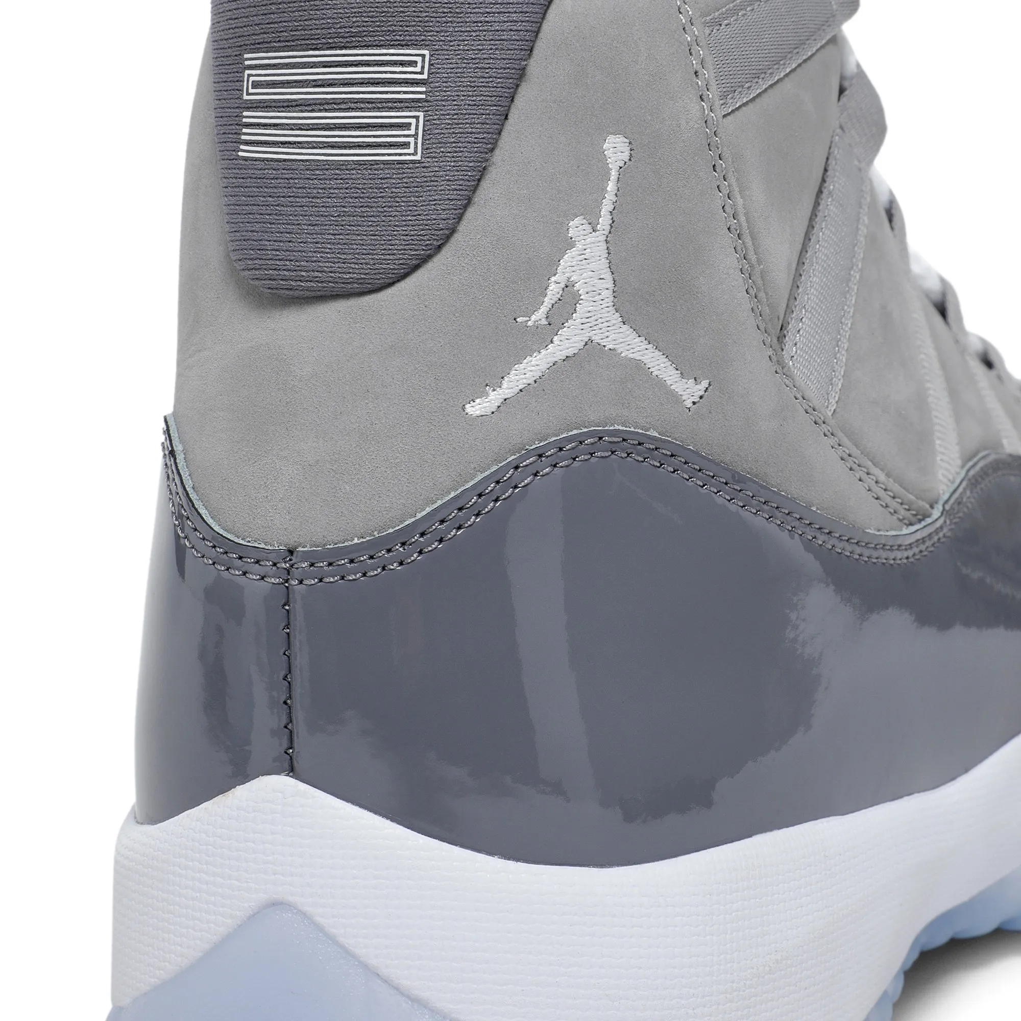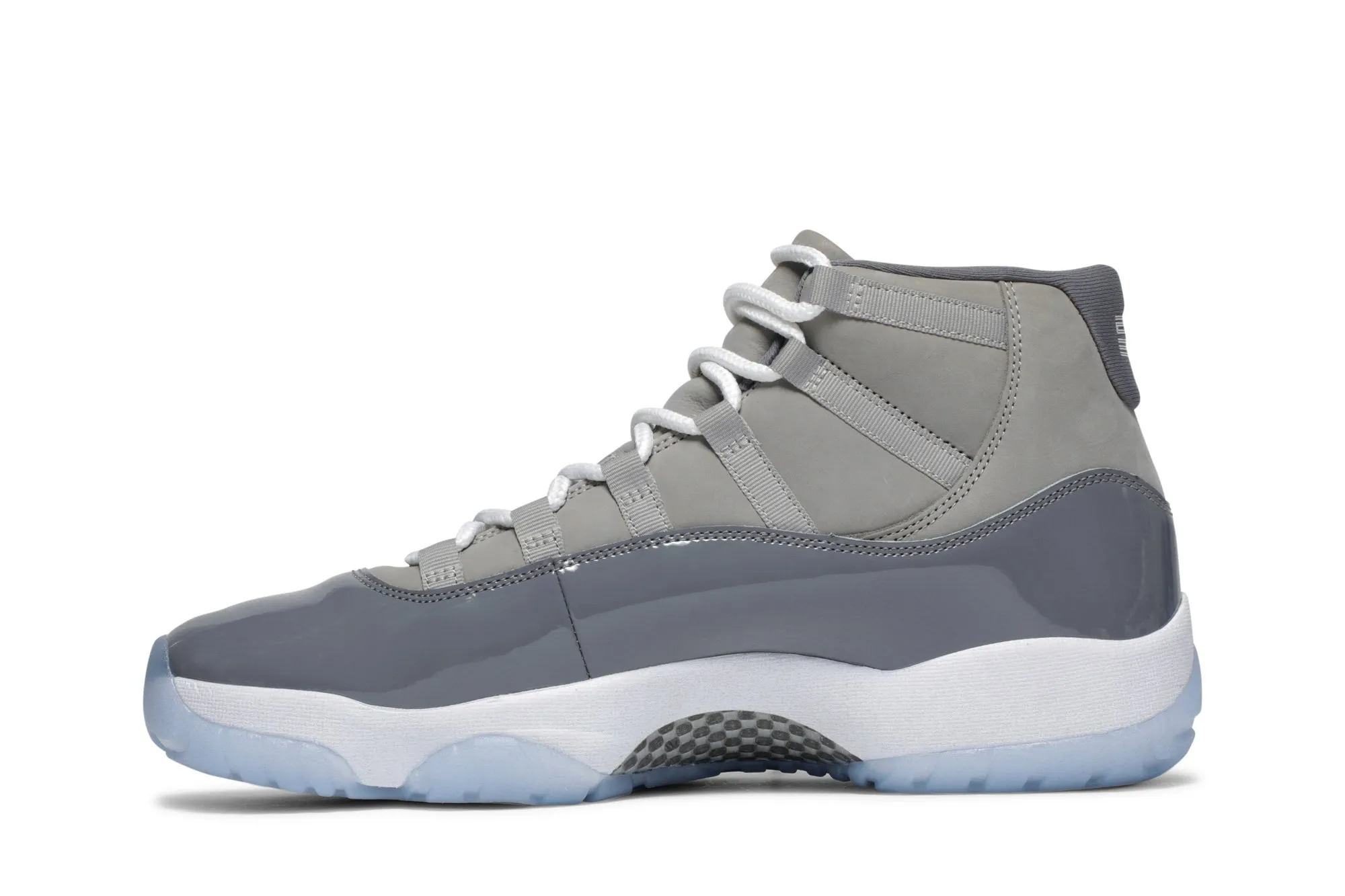 The 2021 edition of the Air Jordan 11 Retro Cool Grey brings back a colorway first released in 2001 and retroed again in 2010. Celebrating the 20th anniversary of the original launch, the mid-top build is faithful to the original, featuring a nubuck upper with tonal webbing lace loops and a shiny patent leather overlay, all rendered in tones of Medium and Cool Grey. A white Jumpman logo is embroidered on the lateral ankle, while a stylized 23 decorates the heel notch. Lightweight cushioning is provided by a full-length Air-sole unit housed within a white Phylon midsole. Underfoot, a translucent outsole reveals a carbon fiber spring plate for enhanced on-court responsiveness.