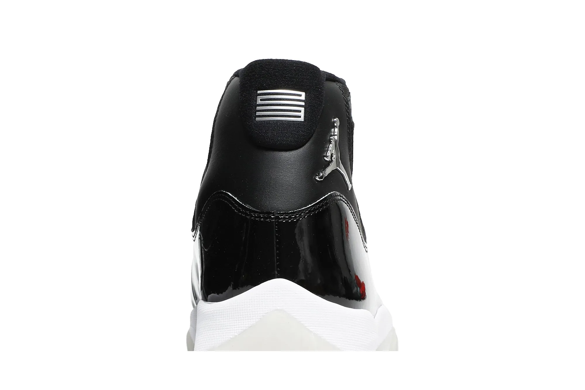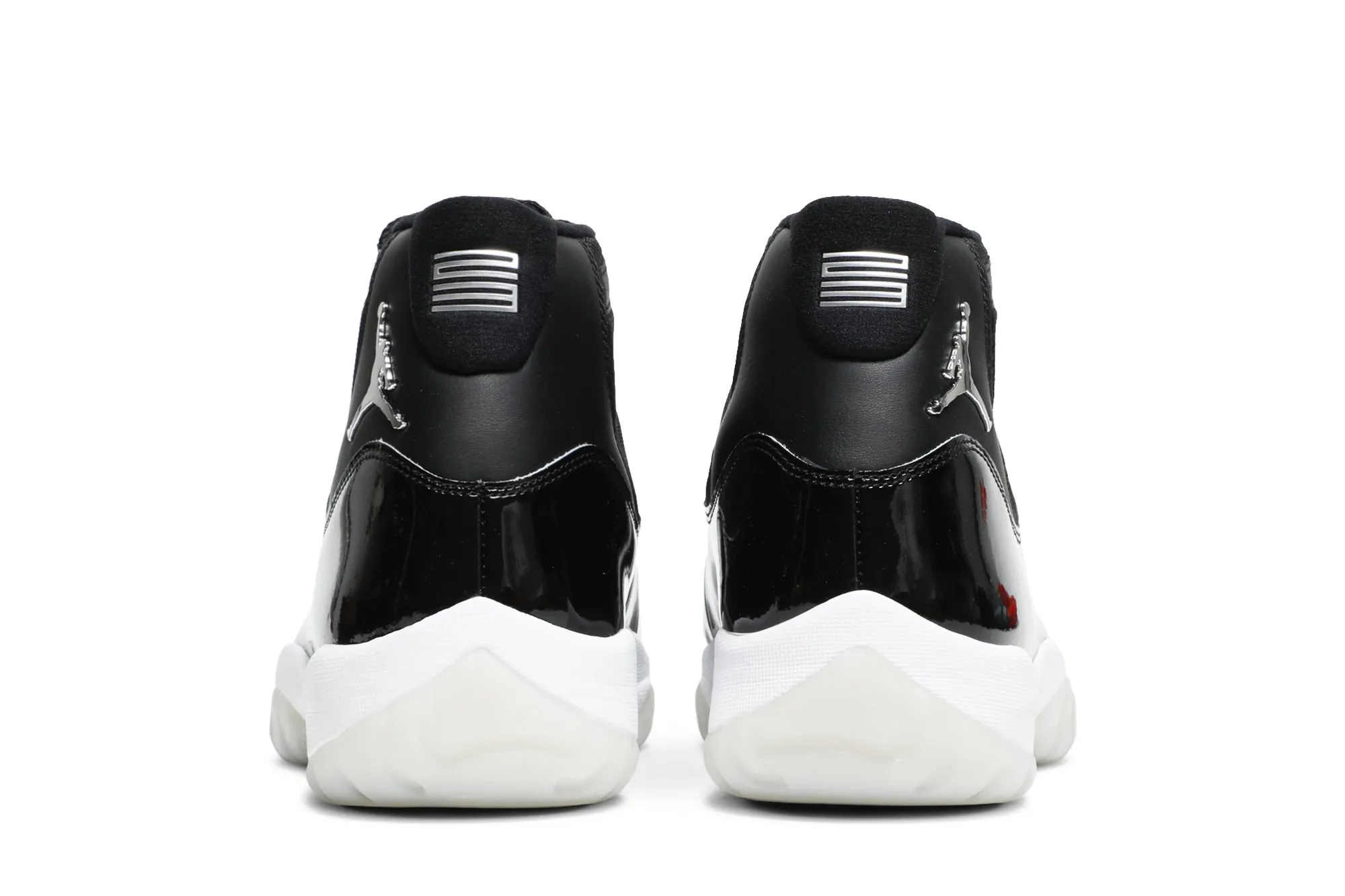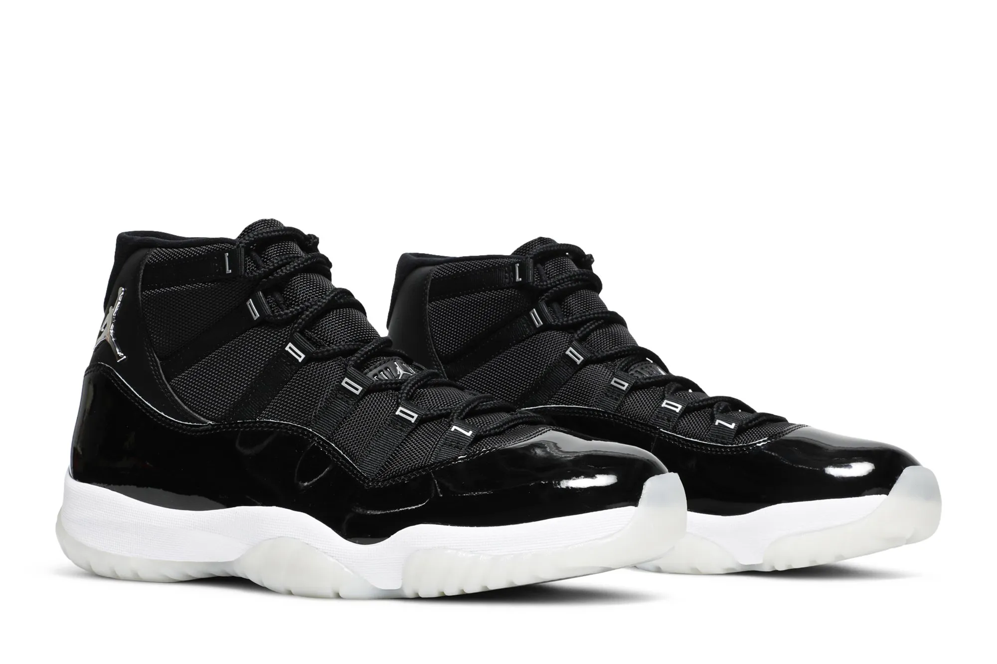 The Air Jordan 11 Jubilee, also known as the Air Jordan 11 '25th Anniversary', celebrates the classic silhouettes quarter-century birthday with a monochrome black finish throughout the upper, constructed from a traditional blend of ballistic mesh and patent leather. In keeping with the shoes silver anniversary, a 3D metallic Jumpman and matching 23 branding decorate the heel, while Jordan is spelled out in stylized silver lettering on each of the sneakers eyelets. The mid-top rides on a classic white foam midsole, supported by a translucent rubber outsole.
