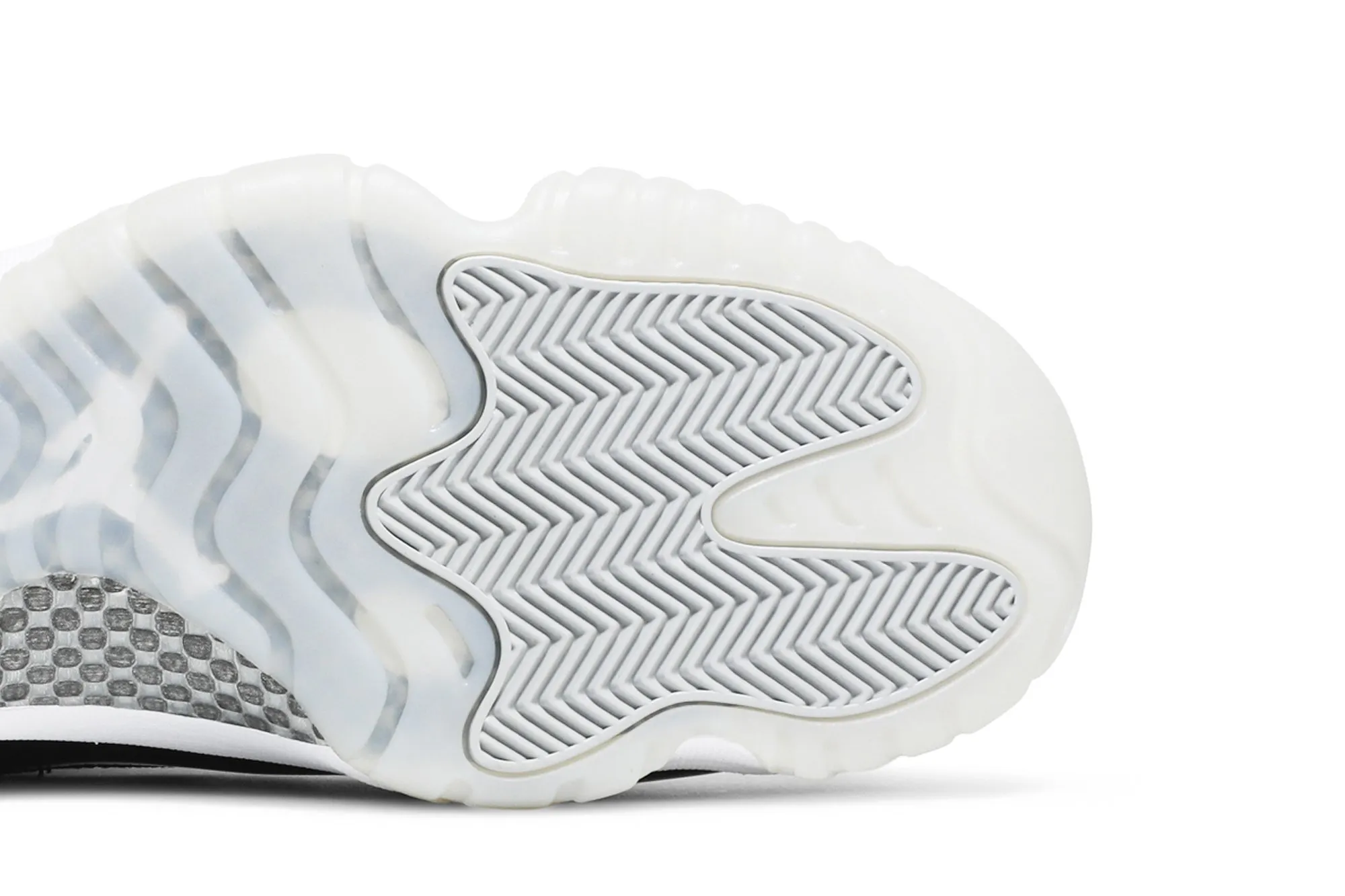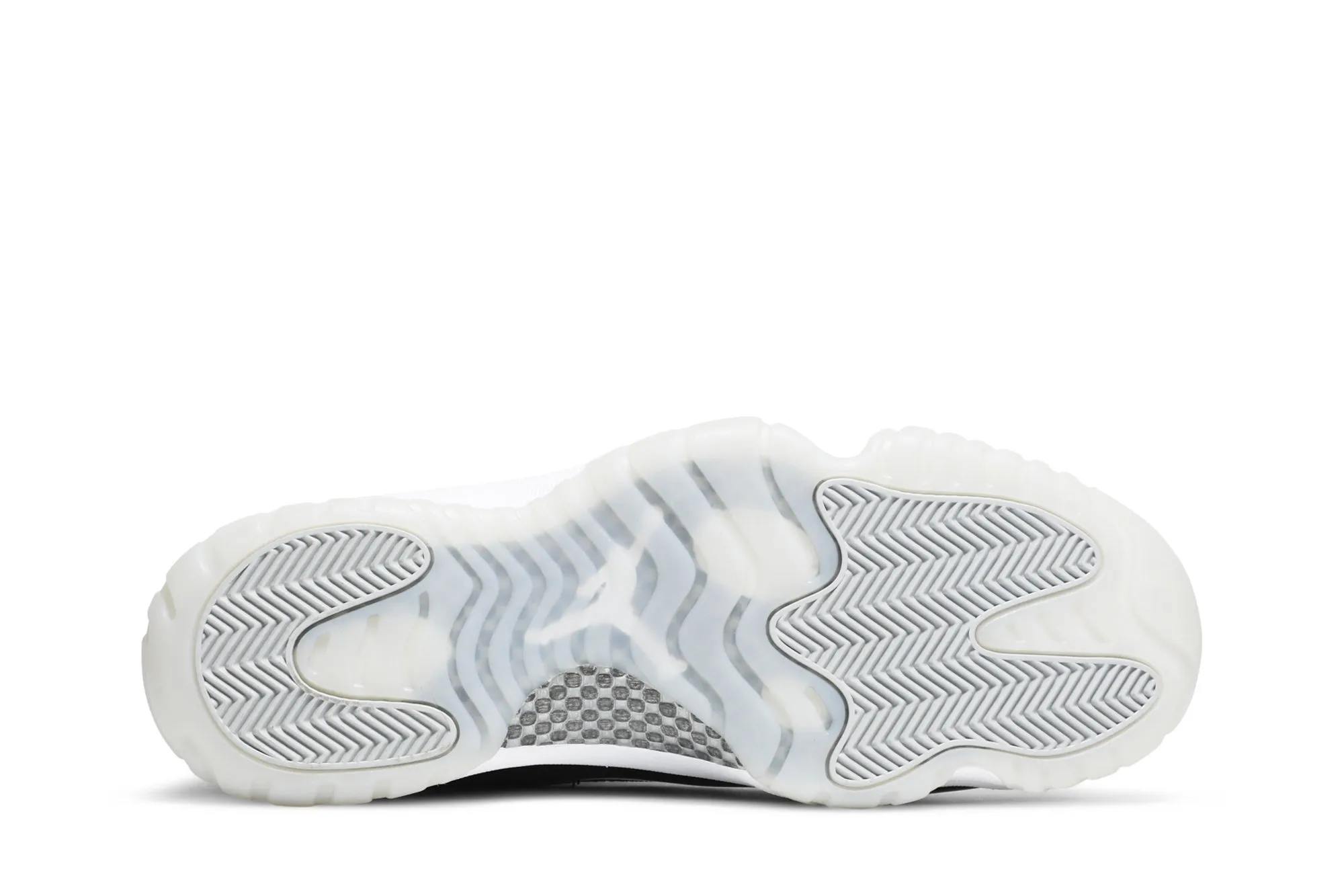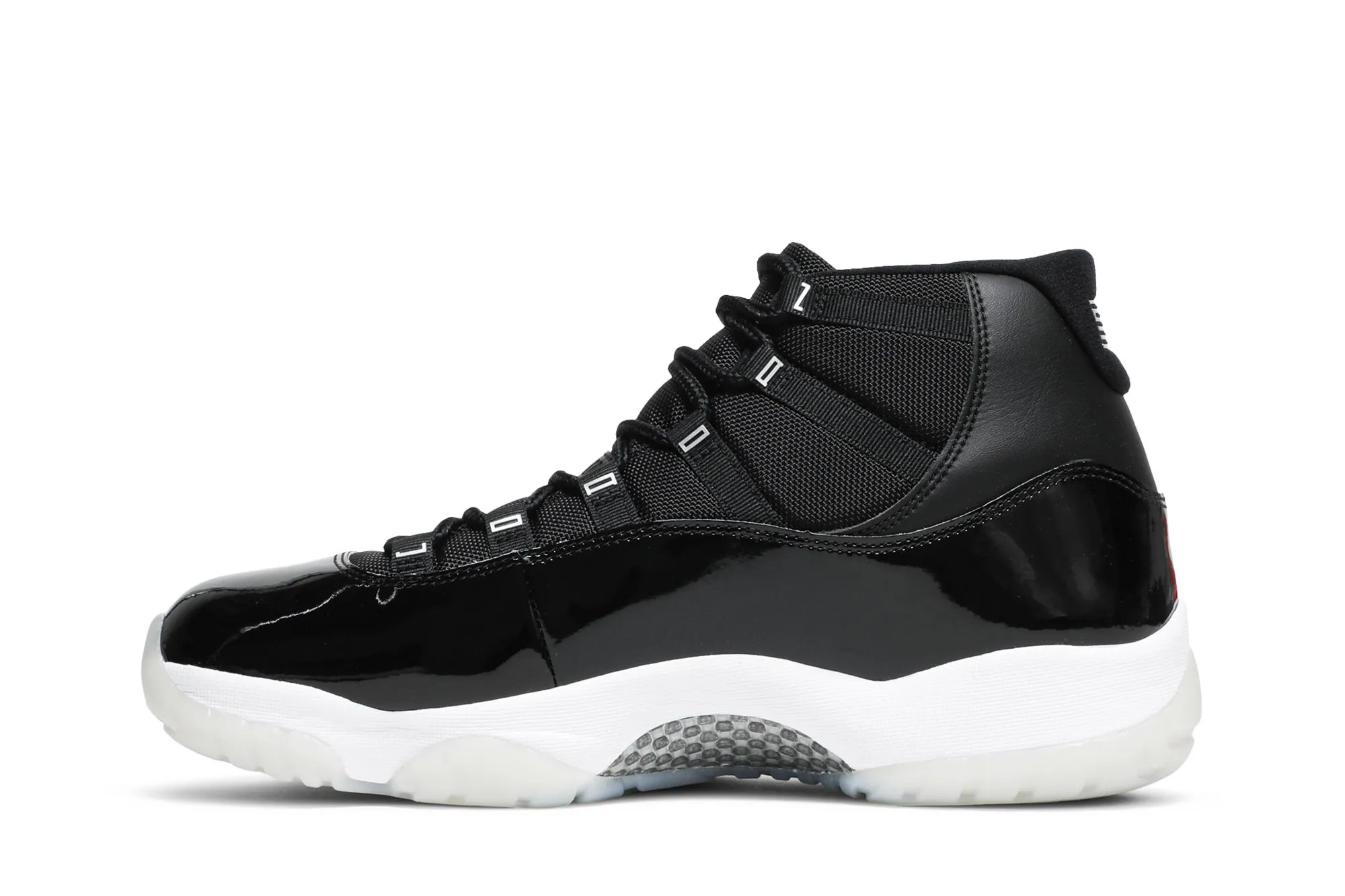 The Air Jordan 11 Jubilee, also known as the Air Jordan 11 '25th Anniversary', celebrates the classic silhouettes quarter-century birthday with a monochrome black finish throughout the upper, constructed from a traditional blend of ballistic mesh and patent leather. In keeping with the shoes silver anniversary, a 3D metallic Jumpman and matching 23 branding decorate the heel, while Jordan is spelled out in stylized silver lettering on each of the sneakers eyelets. The mid-top rides on a classic white foam midsole, supported by a translucent rubber outsole.