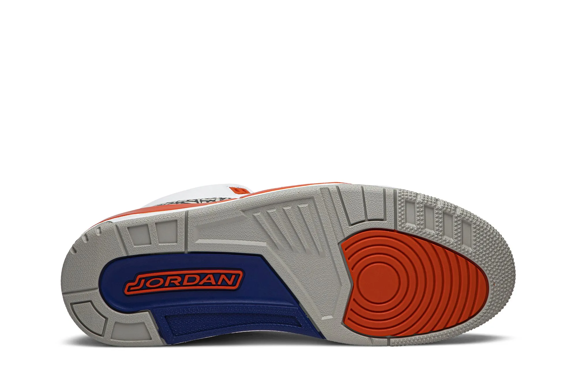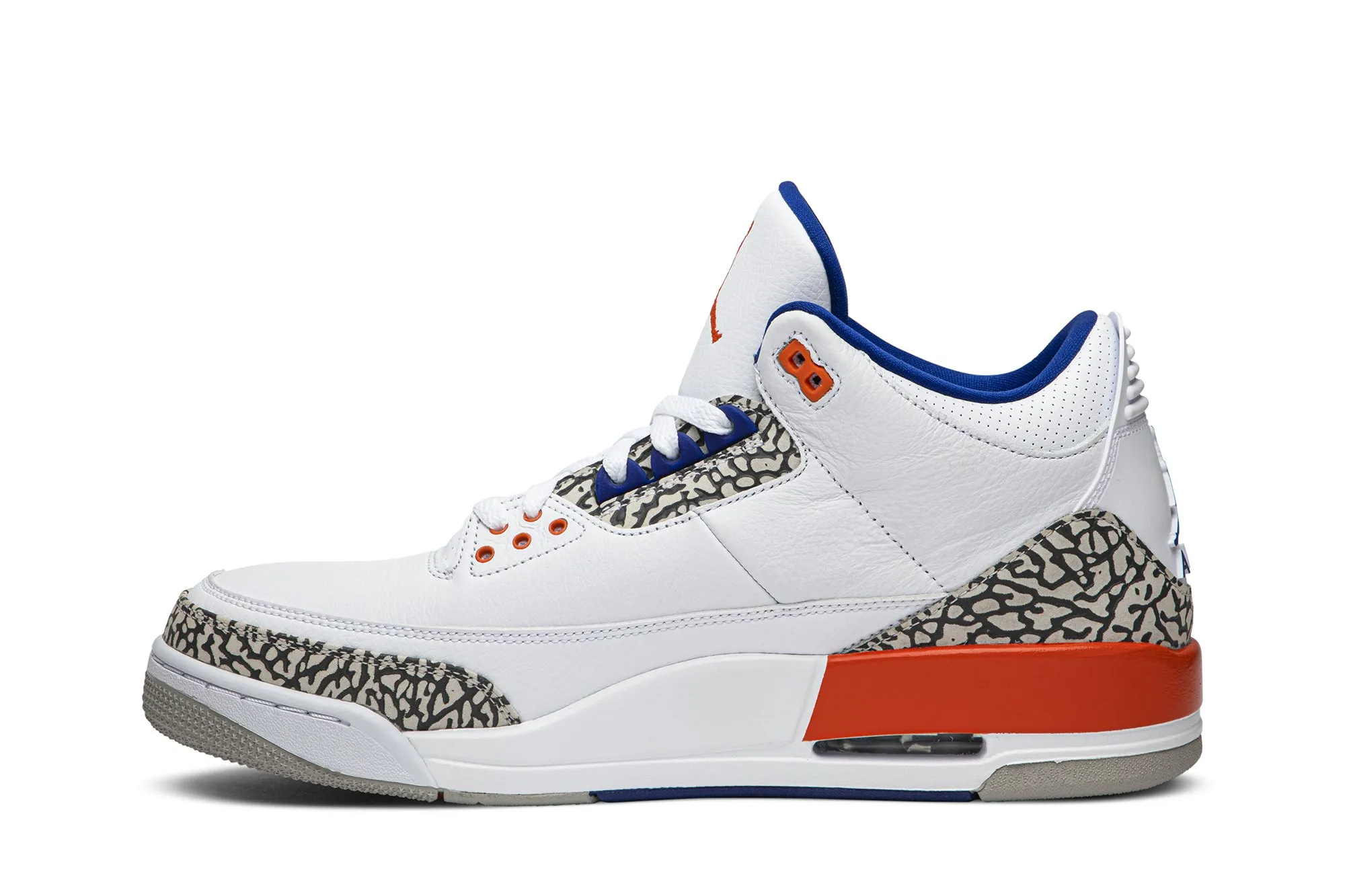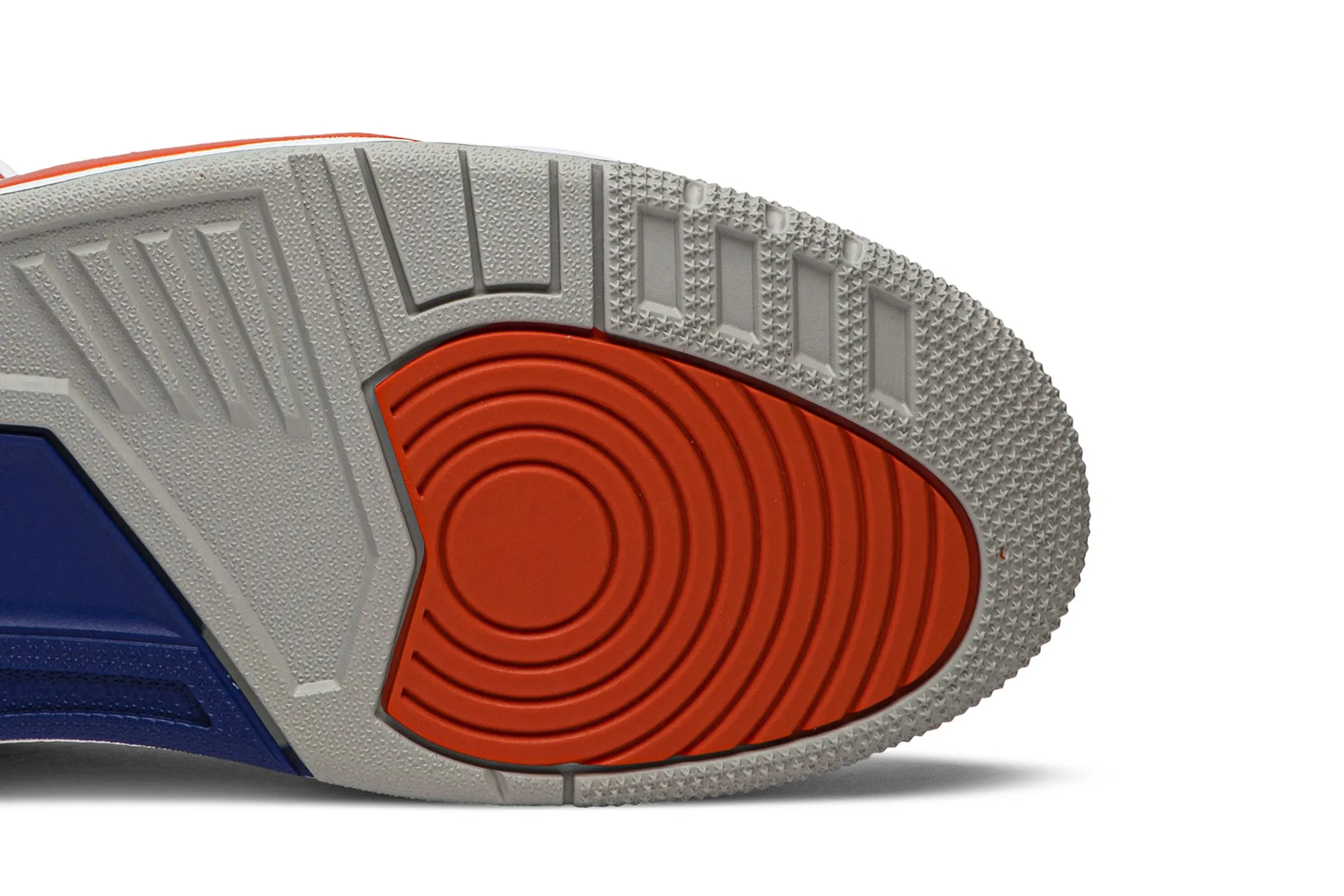 The Air Jordan 3 Retro ‘Knicks Rivals’ boasts a colorway inspired by a team Michael Jordan and the Chicago Bulls had to hurdle for Eastern Conference dominance, the New York Knicks. The AJ3 was the first of numerous Air Jordans designed by Tinker Hatfield and the debut of the Jumpman logo on the tongue. This ‘Knicks Rivals’ retro, released in September 2019, stays true to the original silhouette with a white tumbled leather upper, elephant print on the toe cap and heel, Old Royal and University Orange accents, and a visible Nike Air unit.