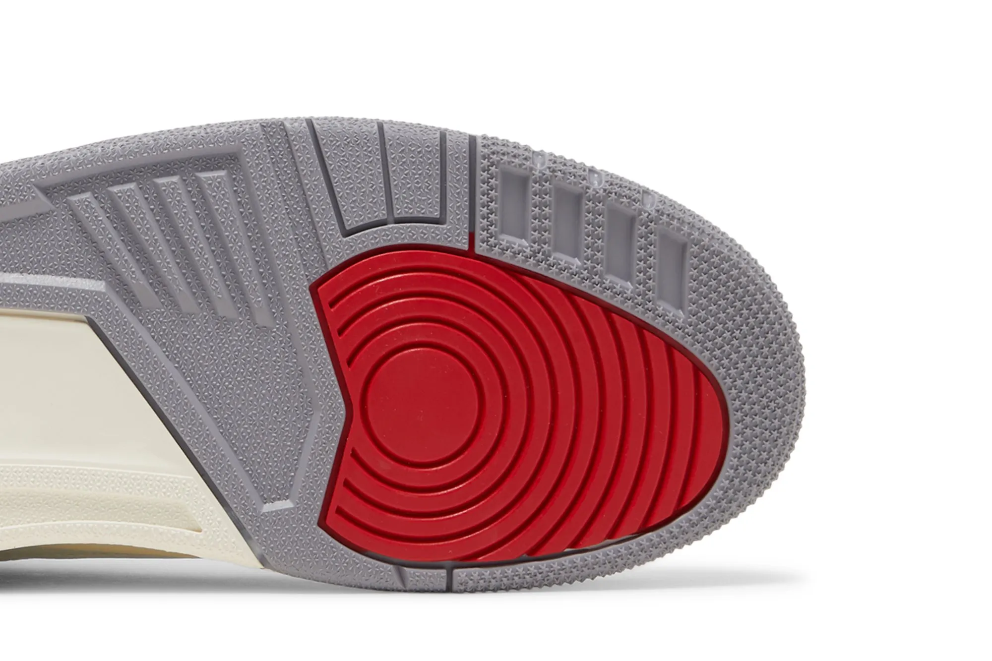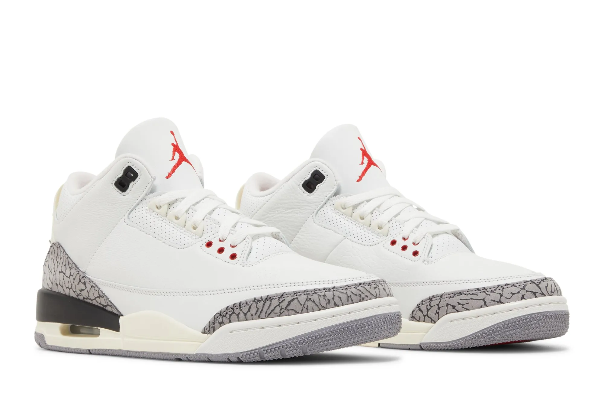 The Air Jordan 3 Retro 'White Cement Reimagined' brings back one of the original colorways, celebrating the 35th anniversary of the AJ3. Designed by Tinker Hatfield, the Reimagined iteration is built to the original 1988 specs. Returning true to form, the white leather upper pairs with elephant print overlays on the heel and toe while hits of Varsity Red appear on the lace loops and the Jumpman logo on the tongue. Nike Air is emblazoned on the back heel tab, while a visible Air unit provides lightweight cushioning. A slight hint of yellowing appears on the back heel and midsole, giving the shoe a vintage look.