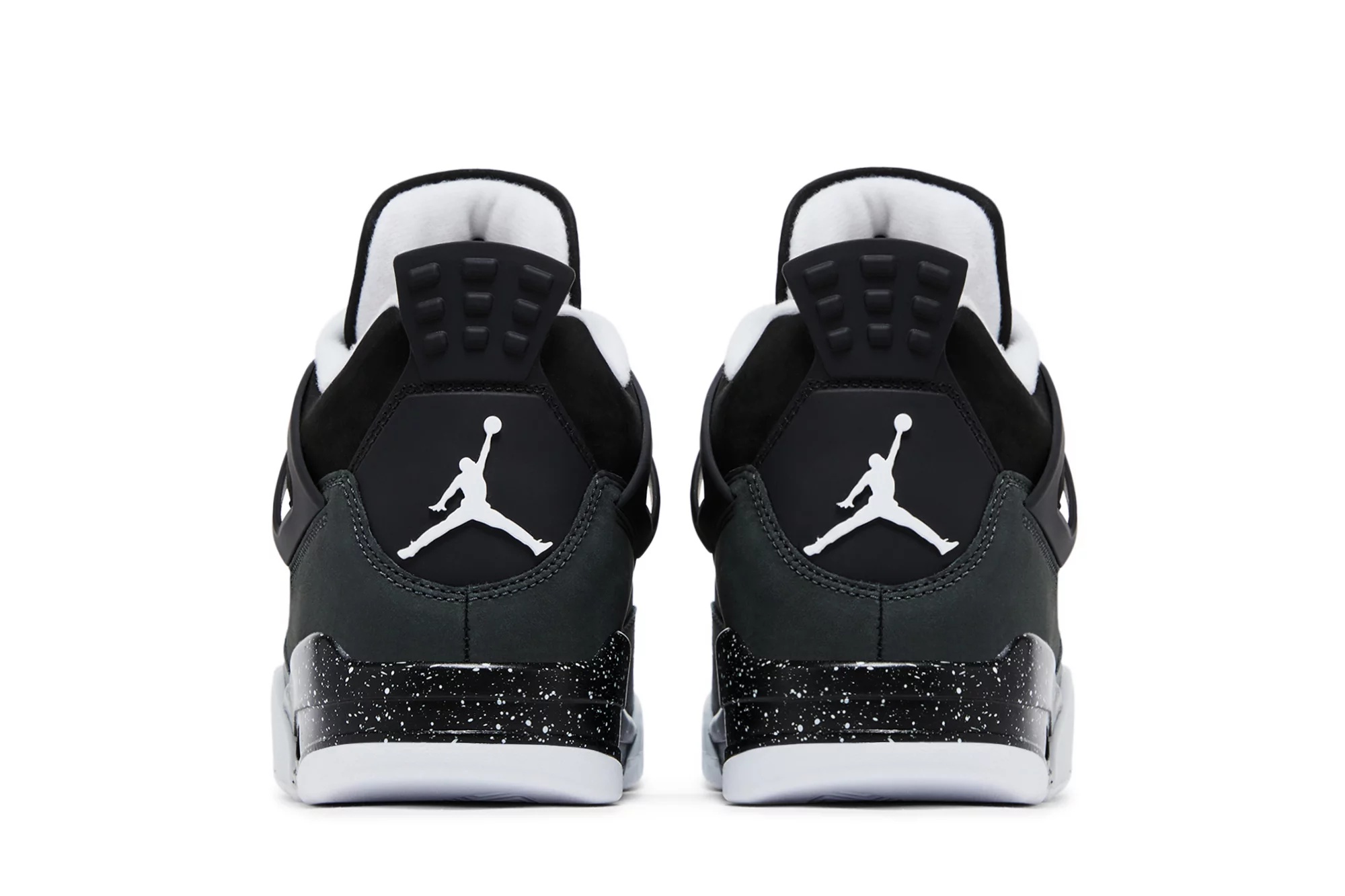 The 2024 Air Jordan 4 Retro 'Fear' is a neutral colorway of the original style. The mid-top has a smooth nubuck upper with a mudguard and toe wrap in two tones of gray. The molded eyelets are white, which matches the Jumpman logo hits on the braided tongue tag and rear heel. The white speckled design covers a black polyurethane midsole with noticeable Air-sole cushioning in the heel.