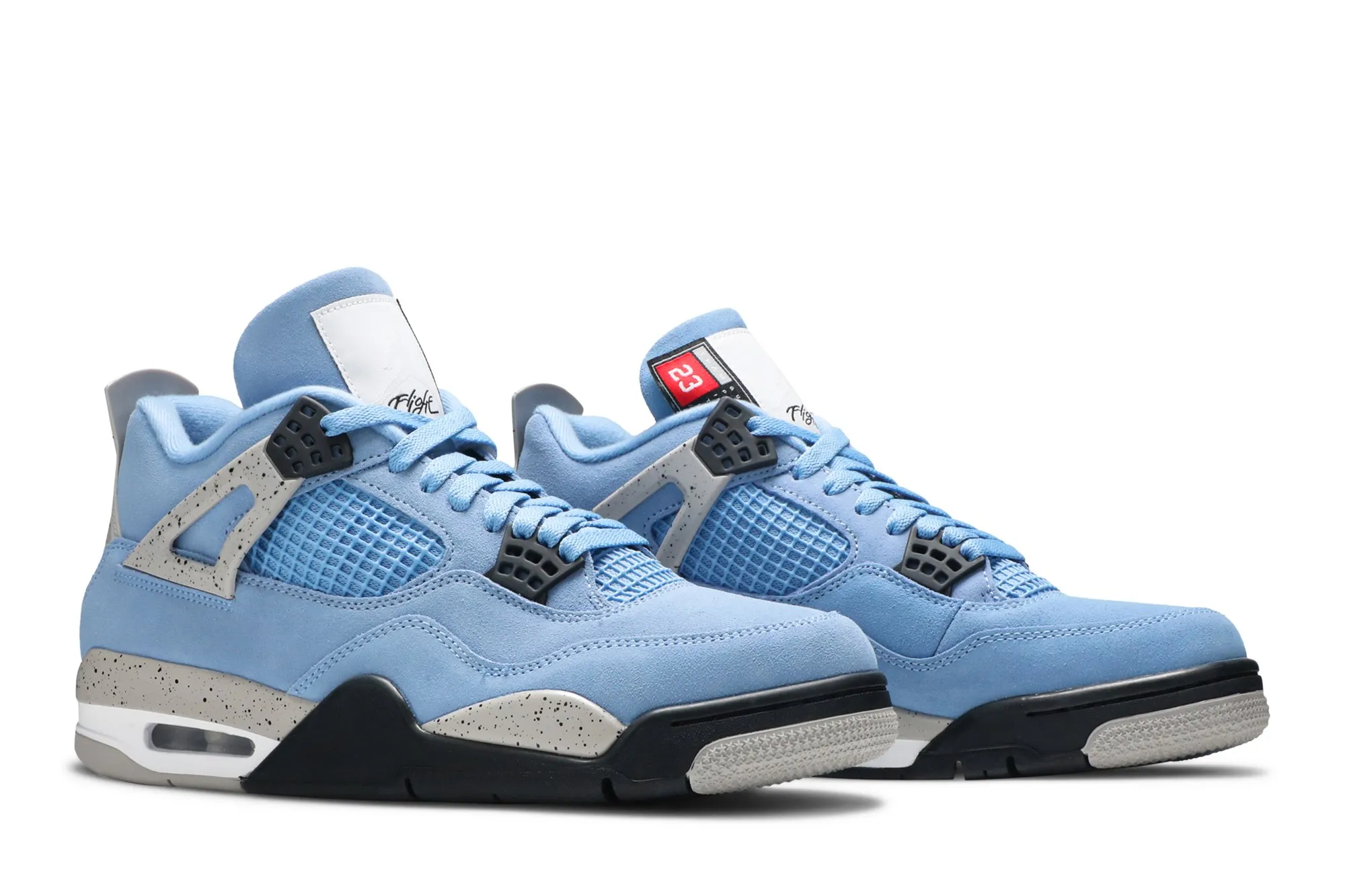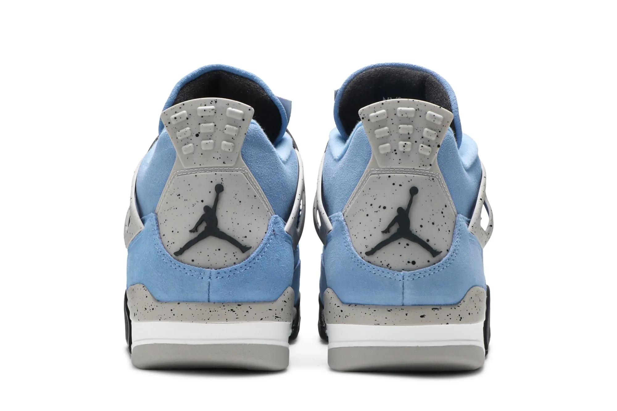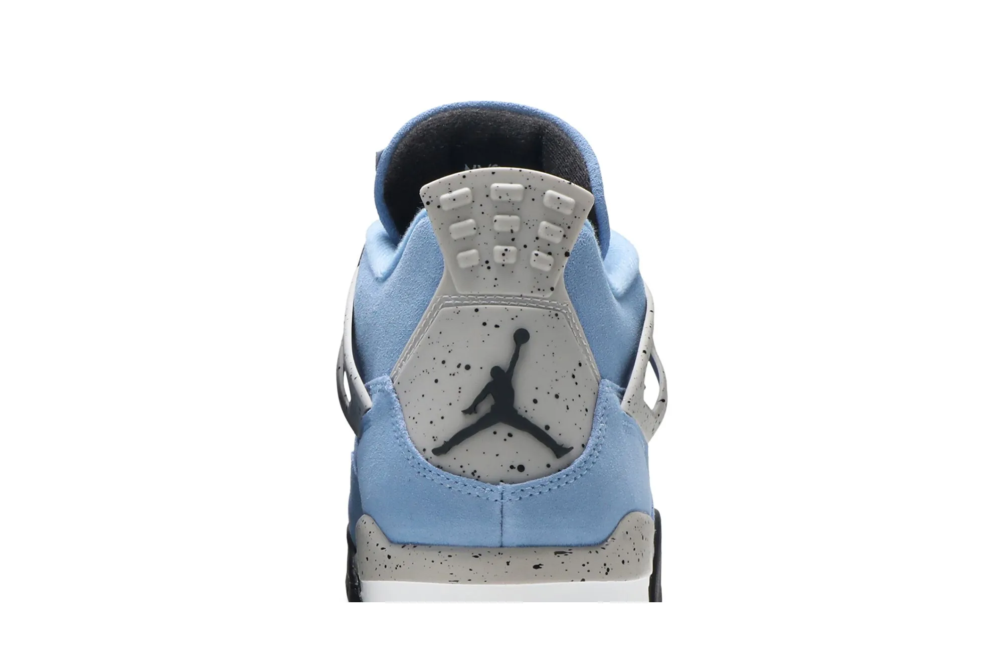The Air Jordan 4 Retro University Blue updates the classic silhouette with a suede upper in a familiar hue inspired by Michael Jordans UNC alma mater. The bright blue palette is contrasted by a speckled grey finish on the sneakers supportive wings and back heel, featuring a raised Jumpman icon in black. Secondary Jumpman branding adorns the woven tongue tag, designed to mimic a jock tag that typically appears on the bottom hem of Jordan jerseys.