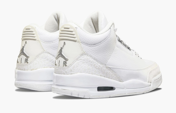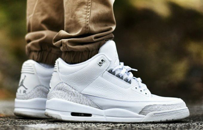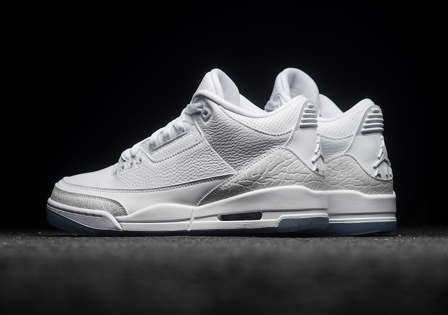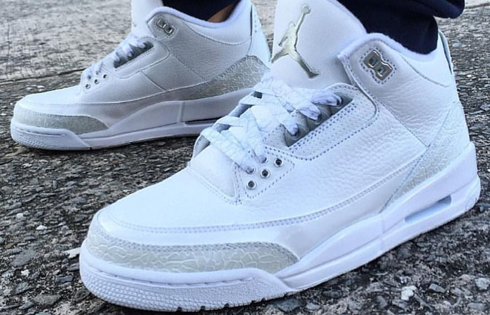 The Air Jordan 3 is one of the most iconic basketball shoes of all time. It was first worn by Michael Jordan in the 1988 Dunk Contest, where he solidified his reputation as a top player in the league. The Air Jordan 3 Retro 'Pure Money' is a clean, all-white version of the original shoe that was released in 2007. It features metallic detailing on the lace eyelets and classic elephant print on the toe panel and heel. This shoe is perfect for any fan of the Air Jordan brand or anyone who wants a stylish, versatile sneaker to wear on and off the court.