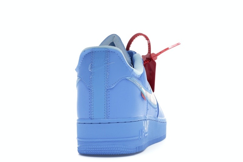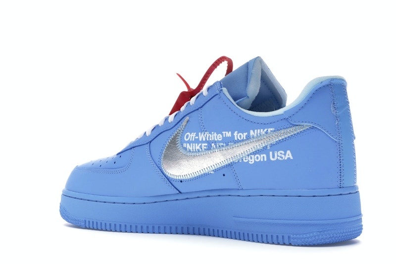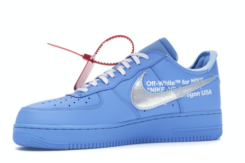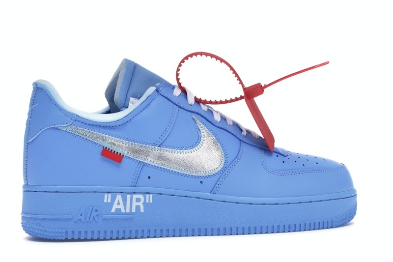 The Nike Off-White x Air Force 1 Low '07 'MCA' shoe showcases a University Blue leather upper with a Metallic Silver Swoosh and red tab. The design features distinctive stitching and a deconstructed appearance, including the iconic zip tie and quoted branding. The midsole and outsole match in University Blue, creating a unified look. White laces and Off-White™ branding below the swoosh complete the lacing system. This shoe offers a versatile and stylish option that can be worn casually or formally, with added comfort from Air cushioning and exposed-foam tongue and collar.