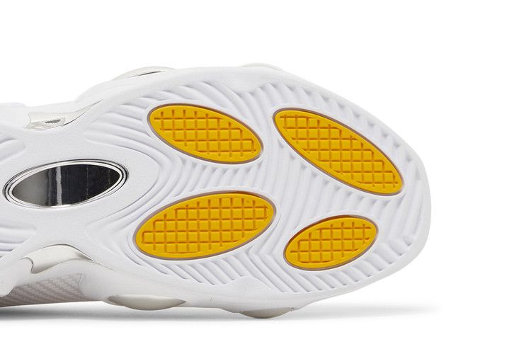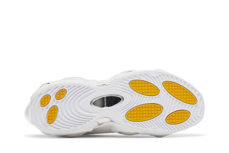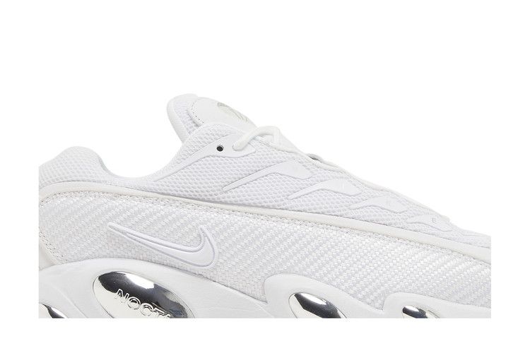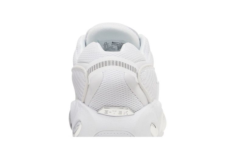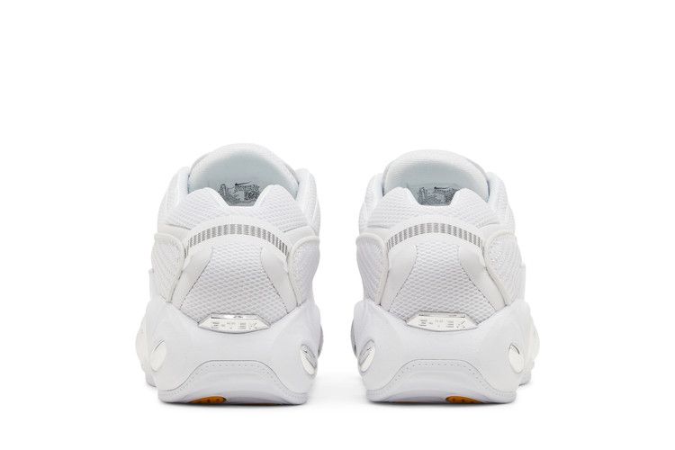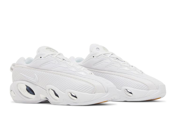 The NOCTA x Nike Glide Triple White delivers a clean colorway of the lifestyle silhouette based on the Zoom Flight 95 basketball shoe. The upper combines breathable white mesh with woven textile on the midfoot overlay. The latter is accented with a molded mini-Swoosh, while a jeweled NOCTA logo adorns the tongue. The sneaker rides on a bulky Phylon midsole, featuring Zoom Air cushioning in the forefoot and unique bug eye detailing embedded in the sidewall.