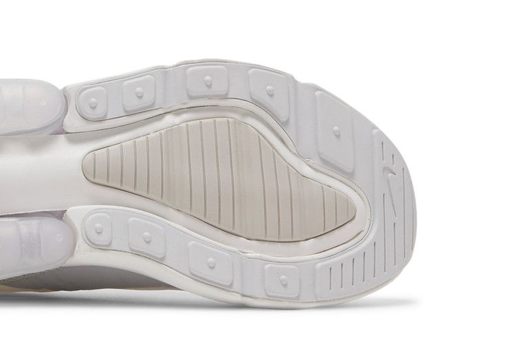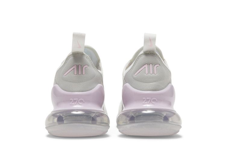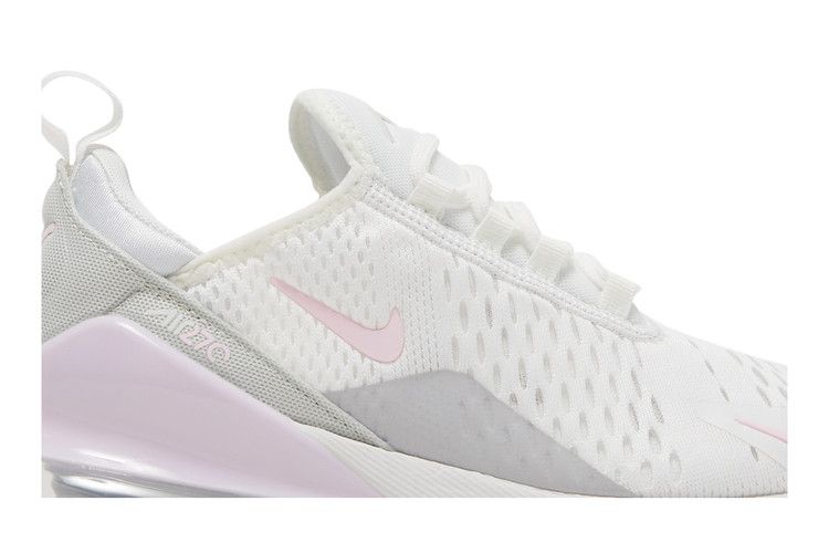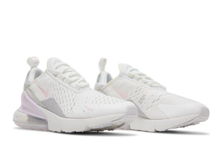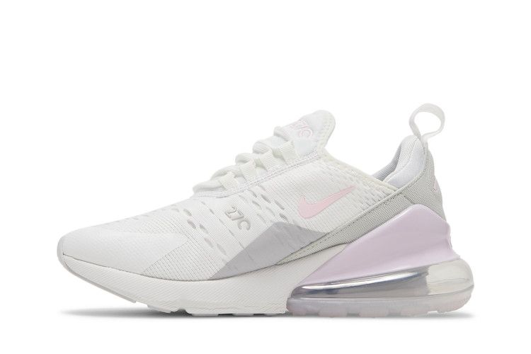 The Nike womens Air Max 270 Summit White Regal Pink features pastel accents on the first ever Nike Air shoe designed for lifestyle. Ventilated white mesh is deployed on the upper, featuring no-sew overlays and a stretchy inner sleeve for a snug fit. The sneakers various branding elements are rendered in a soft pink hue, matching the TPU heel clip that cradles the back of the foot. Lightweight cushioning is provided by a plush foam midsole and a large-volume Max Air unit that offers 270 degrees of visibility.