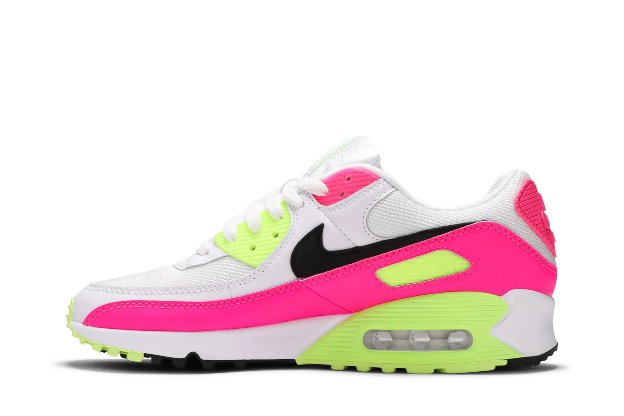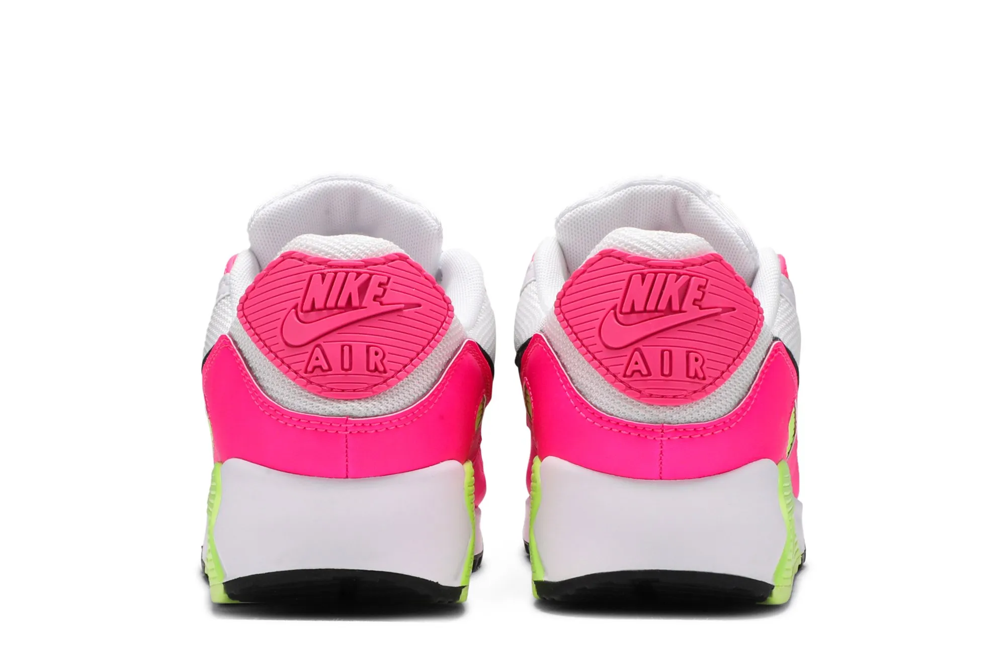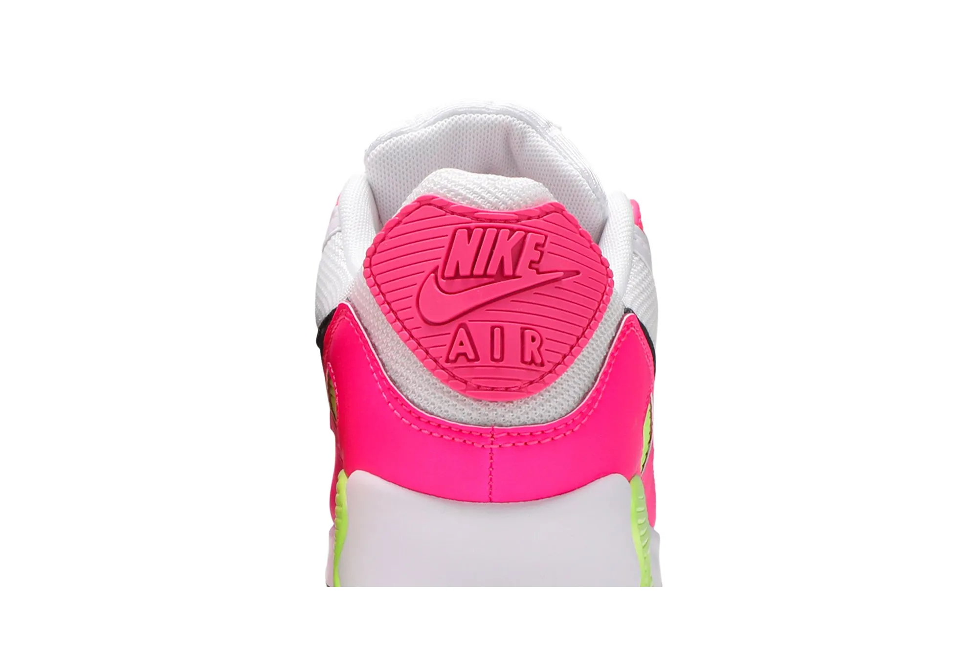 The Nike Air Max 90 ‘Watermelon’ celebrates the silhouette’s 30th anniversary with a vibrant color palette executed on a traditional build. The upper, constructed from white mesh with a matching white leather overlay, is enlivened with accents in contrasting Pink Blast and Ghost Green hues. A padded collar, along with a soft foam midsole with visible Max Air cushioning, combine to deliver a smooth and comfortable ride.