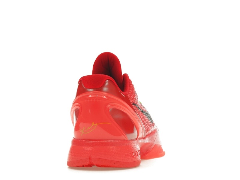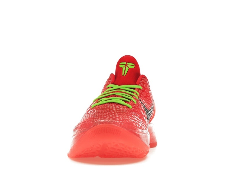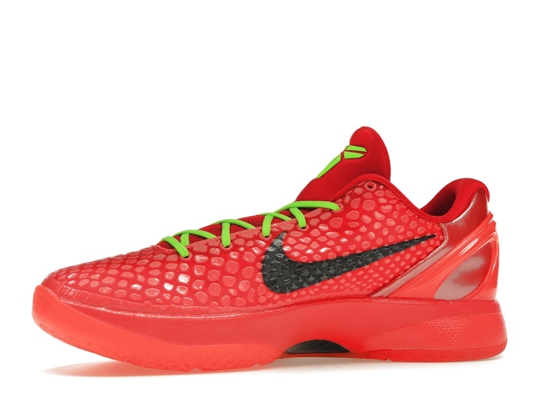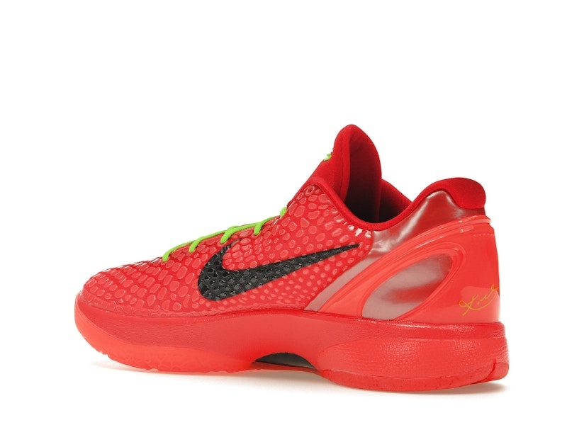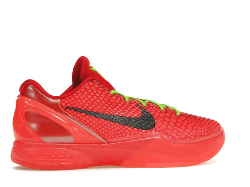 The Nike Zoom Kobe 6 Protro Reverse Grinch delivers a color-inverted version of the iconic Grinch colorway from 2010. A bright crimson color is executed on the scaly micro-mesh upper, secured with neon green laces and accented with a contrasting black Swoosh. A padded low-cut collar allows for maximum range of motion, while a molded TPU heel counter provides rearfoot stability. The sneaker sits on a lightweight Cushlon midsole with a springy Zoom Air unit nestled in the forefoot.