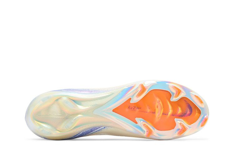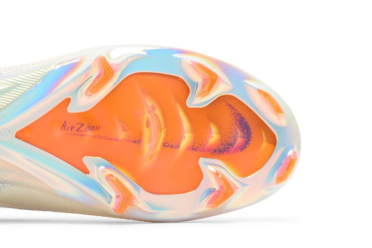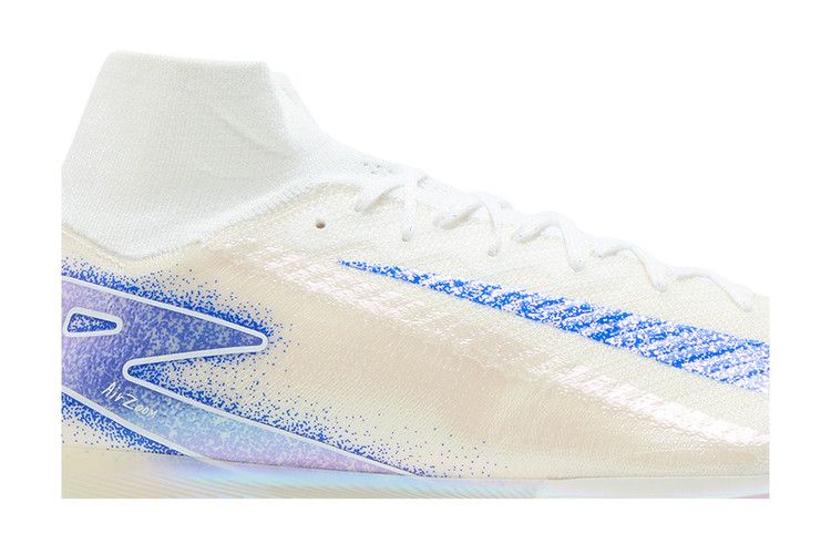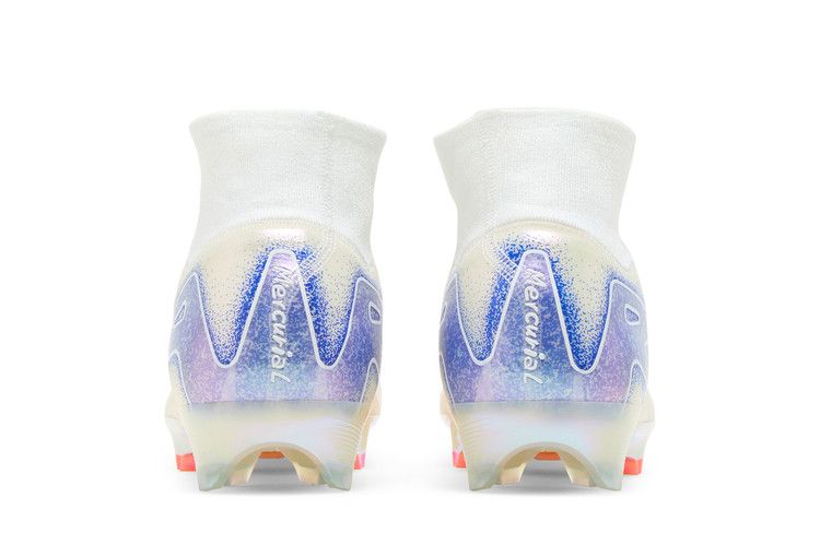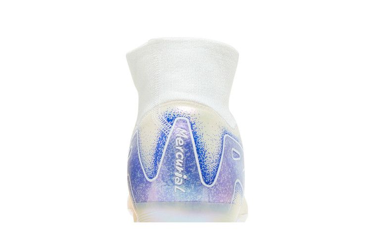 The Nike Zoom Mercurial Superfly 10 Elite FG 'Blueprint Pack' delivers a performance soccer boot made for play on slightly wet, short-grass pitches. A speckled blue Swoosh decorates the white Flyknit upper, featuring a Dynamic Fit collar and a sticky Gripknit overlay, good for enhanced control when dribbling at high speeds. 'AIR' wraps around the heel in oversized lettering, nodding to the Zoom Air unit built into the iridescent outsole plate. A wave-like traction pattern, along with chevron and blade studs, provide optimal grip.