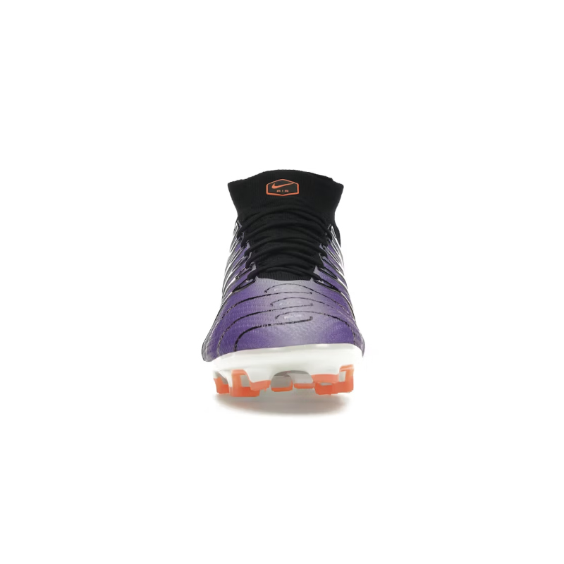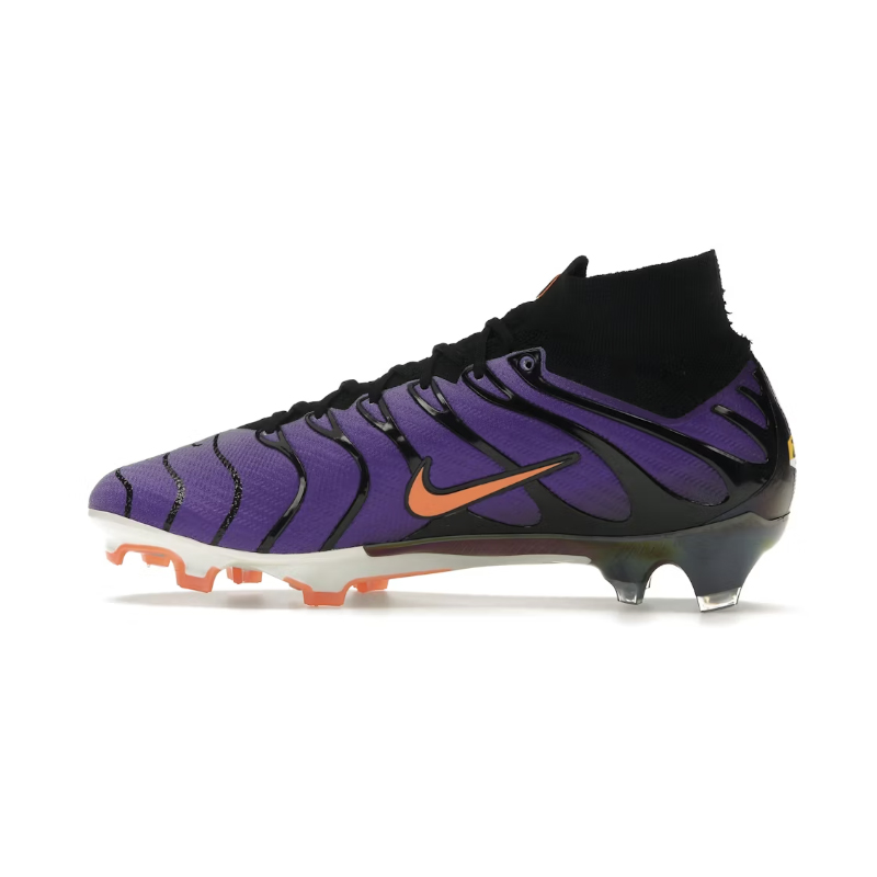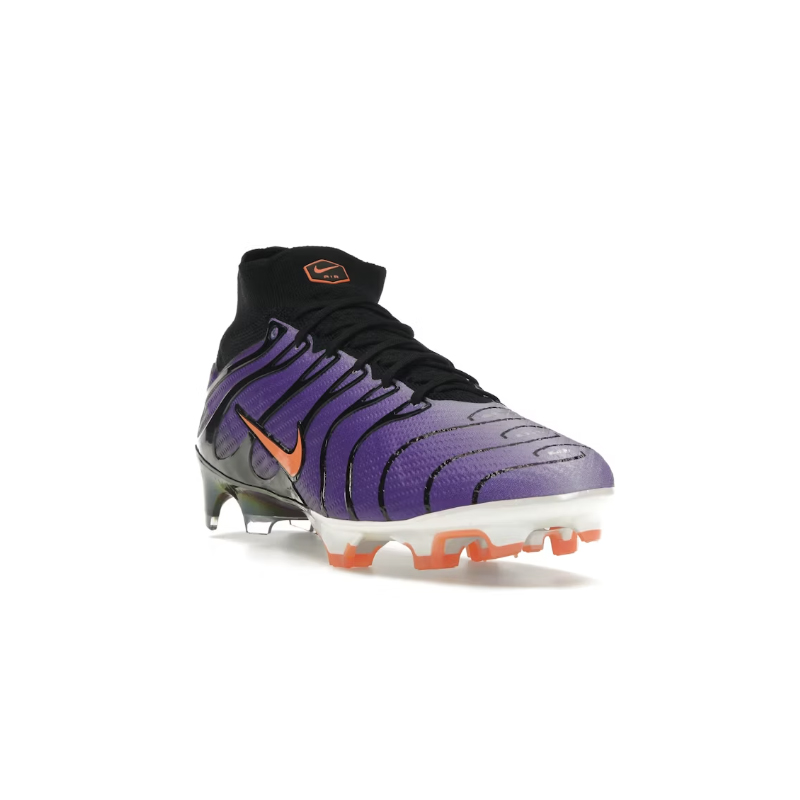 The Nike Zoom Mercurial Superfly 9 Elite FG 'Air Mercurial TN – Voltage Purple' delivers a performance soccer cleat inspired by the Air Max Plus. A gradient purple finish is executed on the Vaporposite+ upper, which is fortified with a black TPU cage and accented with an orange signature Swoosh. A stretchy Flyknit collar provides a snug and secure fit. Zm Air branding on the back heel and sockliner give a nod to the classic Tn Air badge of the Air Max Plus. Fitted with Zoom Air cushioning, the soleplate is underpinned by tri-star studs for optimal grip.